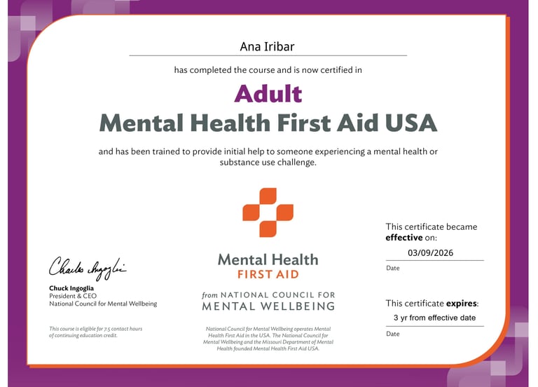 I approach this work with a commitment to empathy, advocacy, and culturally competent support. I hold nationally recognized certifications in Mental Health First Aid, QPR Suicide Prevention, and Trauma-Informed Care, which provide training in recognizing risk, responding to crisis situations, and delivering trauma-informed, client-centered support.